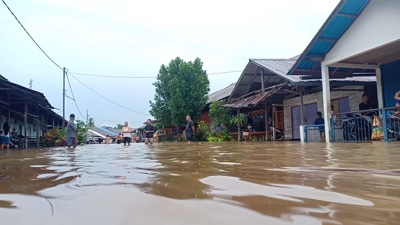 Selain menggenangi rumah warga, derasnya arus sungai juga hampir merobohkan sebuah rumah yang berada di bantaran sungai Mandor.