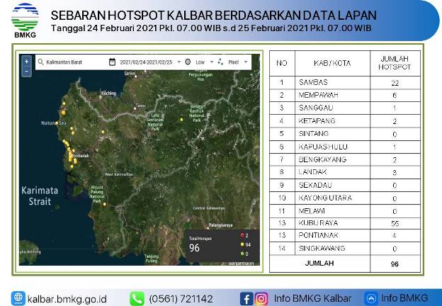 Daerah tertinggi hotspotnya, Kabupaten Kubu Raya dengan 55 titik. Semenara di Kota Pontianak ada empat titik.