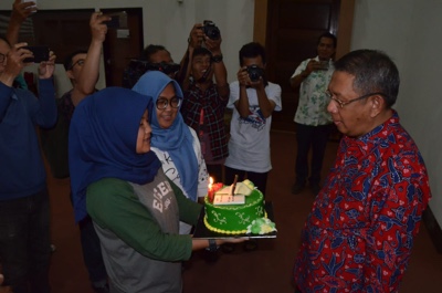 PONTIANAK -Sejumlah wartawan dari berbagai media, baik Cetak, Elektronik maupun Online memberikan kejutan kue ulang tahun kepada Gubernur Kalbar, Sutarmidji, di rung kerja Gubernur, Jumat (30/11/2018). Kue ulang tahun tersebut diberikan kepada Sutarmidji dalam rangka perayaan ulang tahunnya ke-56 yang ...