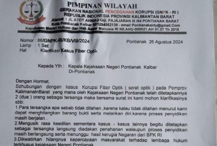 PONTIANAK, RUAI.TV – Kejaksaan Negeri (Kejari) Pontianak kembali menjadi sorotan setelah menerima surat dari Pimpinan Wilayah Gerakan Nasional Pencegahan Korupsi Republik Indonesia (GNPK RI) Kalimantan Barat. Surat bernomor 86/GNPK-RI/KB/VIII/2024 tertanggal 26 Agustus 2024 itu meminta klarifikasi terkait kasus dugaan korupsi ...