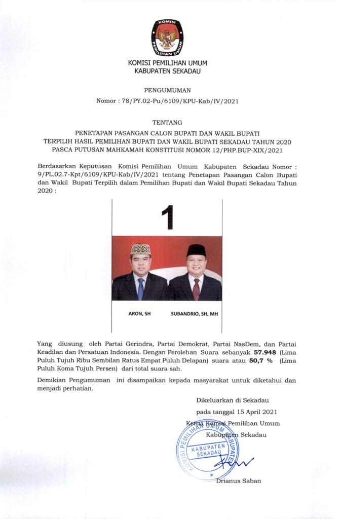 PENETAPAN PASANGAN CALON BUPATI DAN WAKIL BUPATI TERPILIH HASIL PEMILIHAN BUPATI DAN WAKIL BUPATI SEKADAU TAHUN 2020 PASCA PUTUSAN MAHKAMAH KONSTITUSI NOMOR 12/PHP.BUP-XIX/2021.