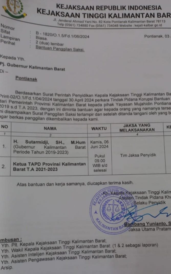 Pada 06 Juni 2024, surat panggilan sebagai saksi dinlayangkan kepada Mantan Gubernur Kalbar dan Ketua Tim Anggaran Pemerintah Daerah (TAPD) untuk tahun anggaran 2021-2023. Namun, Sutarmidji diduga mangkir dan tidak memenuhi panggilan tersebut.