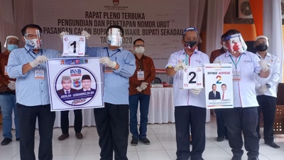 SEKADAU – Komisi Pemilihan Umum Kabupaten Sekadau menggelar pleno pencabutan nomor urut pasangan calon Pilkada Sekadau tahun 2020 di kantor KPU Sekadau, Kamis (24/9/2020). Pleno dipimpin langsung Ketua KPU Sekadau, Drianus Saban. Dalam pleno itu, Pasangan Aron-Subandrio (PAS) mendapat nomor ...