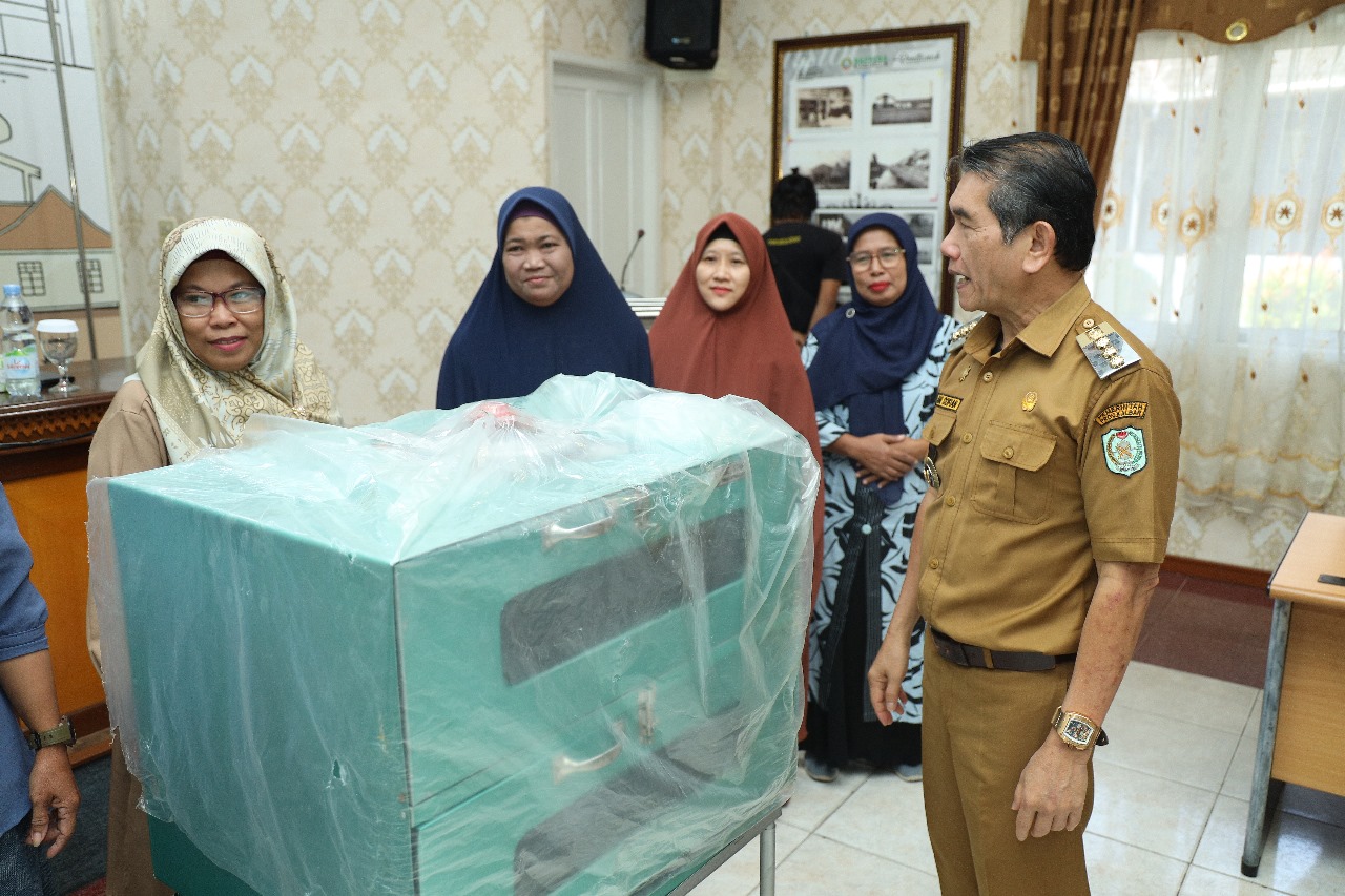 PONTIANAK, RUAI.TV – Pemerintah Kota (Pemkot) Pontianak melalui Dinas Koperasi, Usaha Mikro dan Perdagangan (Diskumdag) Kota Pontianak, menyerahkan bantuan sarana produksi industri kepada 11 pelaku Usaha Mikro Kecil Menengah (UMKM), serta sertifikasi halal kepada 41 pelaku UMKM. Bantuan sarana produksi industri berupa oven, mixer dan sealer diserahkan secara simbolis oleh Pj Wali Kota Pontianak Ani Sofian, di Aula Rohana Muthalib Bappeda Kota Pontianak, Selasa (16/07/2024).