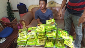 Selain mengamankan pelaku Polisi juga mengamankan barang bukti berupa, 1 (satu) Buah Tas Ransel Gunung Merek Eiger Warna Hitam, 19 (sembilan belas) Bungkus Pelastik Warna Hijau Bertuliskan Guanyinwang yang didalamnya berisikan Kristal Putih diduga Narkotika jenis Sabu, 1 (Satu) Buah handphone Android Merek Xiaomi Redmi Warna Hitam, 1 (Satu) Buah handphone merek samsung lipat warna putih.