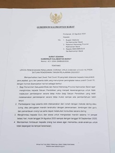 PONTIANAK – Gubernur Kalimantan Barat mengeluarkan Surat Edaran Nomor 421/1909/DIKBUD/2020 pada tanggl 22 Agustus 2020 tentang “Upaya Pencegahan Penularan Corona Virus Disease (COVID-19) Pada Satuan Pendidikan Tahun Pelajaran 2020/2021”.