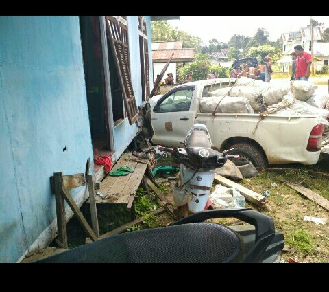 Setelah Itu Mobil Pick Up Toyota Hilix KB 9786 J Juga Menabrak Sepeda Motor Honda Revo Yang Berada Didepannya, Hingga Mobil Pick Up Hilux KB 9786 J Tersebut Berhenti Setelah Menabrak Sepeda Motor Suzuki Shogun KB 4336 ED Warna Merah Putih Yang Sedang Parkir Di depan Rumah Rumah Warga Atas Nama Joni.