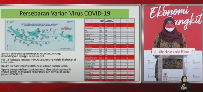 Direktur Pencegahan dan Pengendalian Penyakit Menular Langsung, Ditjen P2P Kementerian Kesehatan, Siti Nadia Tarmizi, memaparkan, konsentrasi varian delta COVID-19 terdeteksi cukup tinggi di 10 provinsi ini.