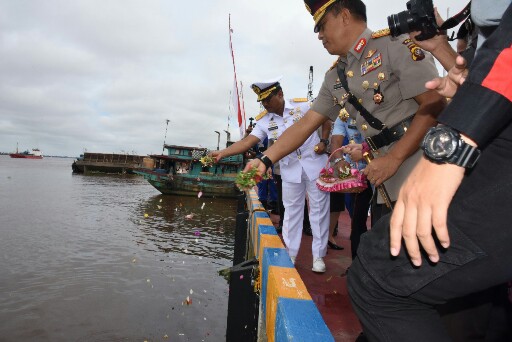 Kemudian acara dilanjutkan Pelarungan karangan bunga dan penaburan bunga didermaga Ditpolairud Polda Kalbar oleh Kapolda Kalbar didampingi Danlantamal XII, Danlanud SPO beserta Wakapolda Kalbar beserta para pejabat undangan dan ibu-ibu Bhayangkari lainnya.