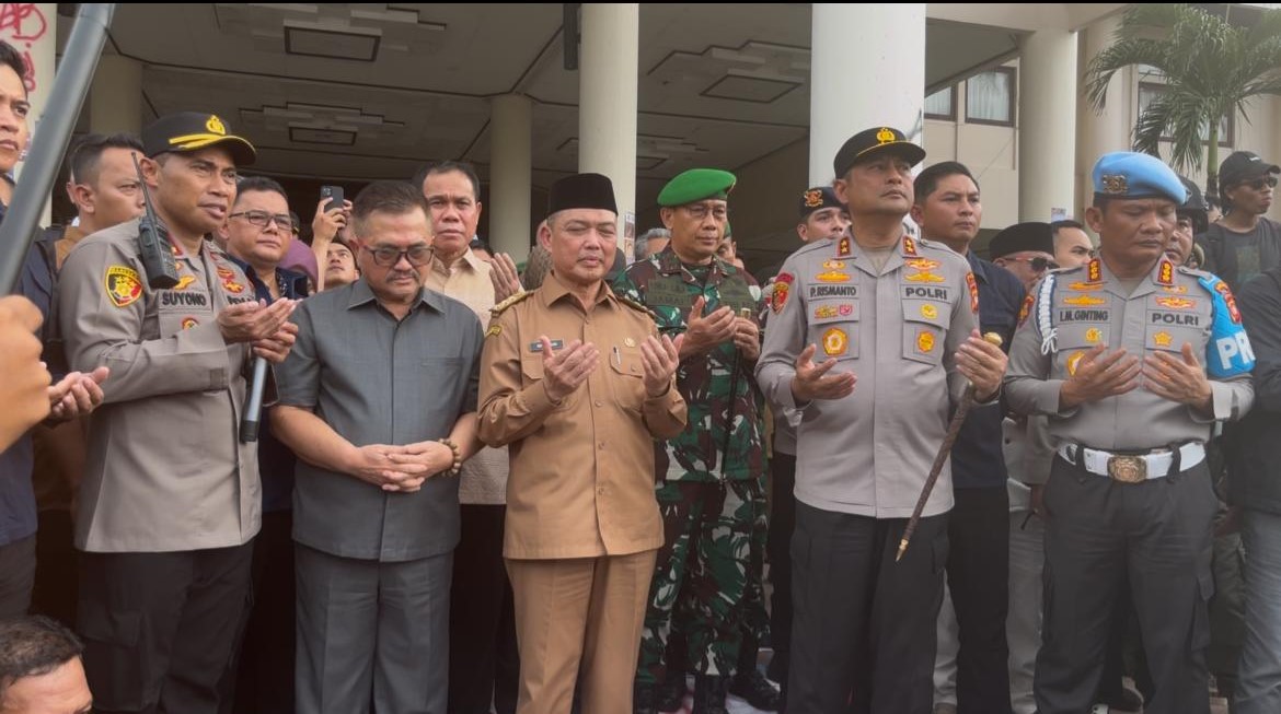 Gubernur Kalbar Ria Norsan, Wakil Gubernur Krisantus Kurniawan, Kapolda Irjen Pol Pipit Rismanto, Pangdam XII/Tanjungpura, Mayjen TNI Jamalulael, serta Ketua DPRD Kalbar Aloysius bersama anggota dewan berdiri di halaman gedung untuk menerima aspirasi mahasiswa.