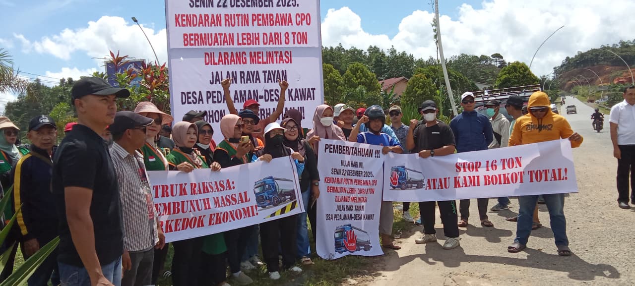 Aksi damai itu berlangsung di pertigaan akses Jembatan Kapuas Tayan dan Jalan Pembangunan, Desa Kawat, Senin (22/12/2025). Warga memprotes maraknya truk bermuatan di atas 8 ton yang nekat melintasi jalan kabupaten.