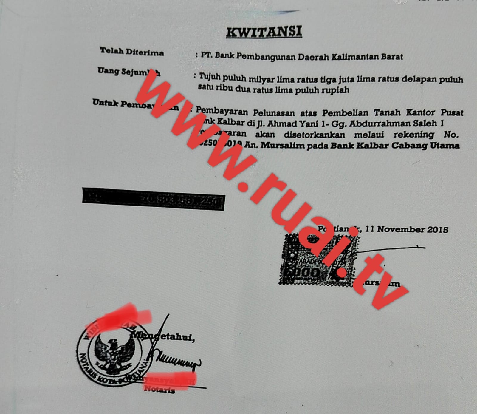 PONTIANAK, RUAI.TV – Kasus dugaan mark up pengadaan tanah oleh Bank Pembangunan Daerah (BPD) Kalimantan Barat semakin mengerucut dengan ditemukannya kwitansi pembayaran dari Bank Kalbar ke rekening pribadi Mursalim.