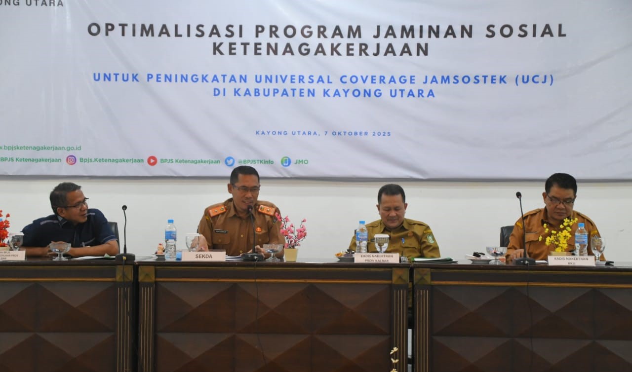 Hal ini disampaikan Sekretaris Daerah Kabupaten Kayong Utara, Erwin Sudrajat, saat menghadiri dan membuka kegiatan Rapat Kerja Monitoring, Evaluasi, dan Asistensi Pelaksanaan Jaminan Sosial Ketenagakerjaan Provinsi Kalimantan Barat Tahun 2025, bertempat di Mahkota Hotel, Sukadana, Selasa (7/10/2025).