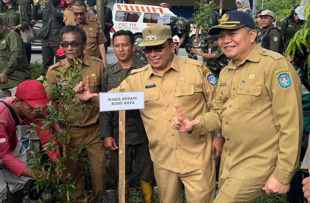 KUBU RAYA, RUAI.TV – Bupati Kubu Raya, Sujiwo, bersama Wakil Bupati Sukiryanto, jajaran Forkopimda, Sekda, Kapolres, Dandim, dan berbagai komunitas lingkungan seperti WALHI, Jiling Borneo, Sahabat Alam Komunity, Sampan, dan Kesling, menanam 1.000 pohon pucuk merah di Jalan Supadio, tepatnya sebelum Vihara Vimalakirti, dalam rangka memperingati Hari Bumi Sedunia.