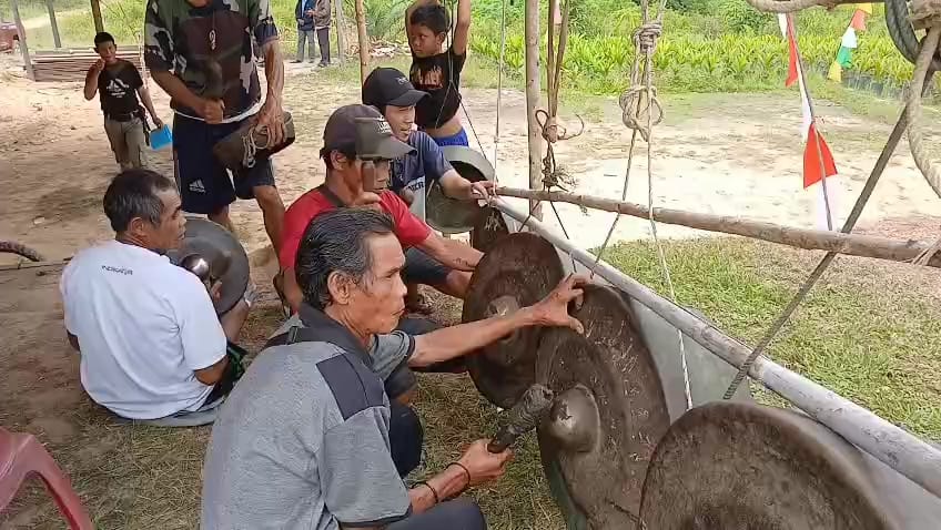 Masyarakat adat di Ella Hilir membunyikan alat musik tradisional sebagai hiburan penyambutan tamu kehormatan saat proses verifikasi dan validasi dua komunitas, yakni Dayak Limbai dan Kebahan Penyelopat. (Foto/ruai.tv)