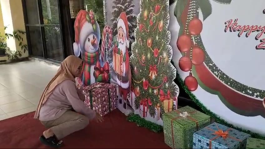 Tak hanya di dalam gedung, halaman kantor juga mendapat sentuhan dekorasi khas Natal, menambah kesan semarak dan hangat.