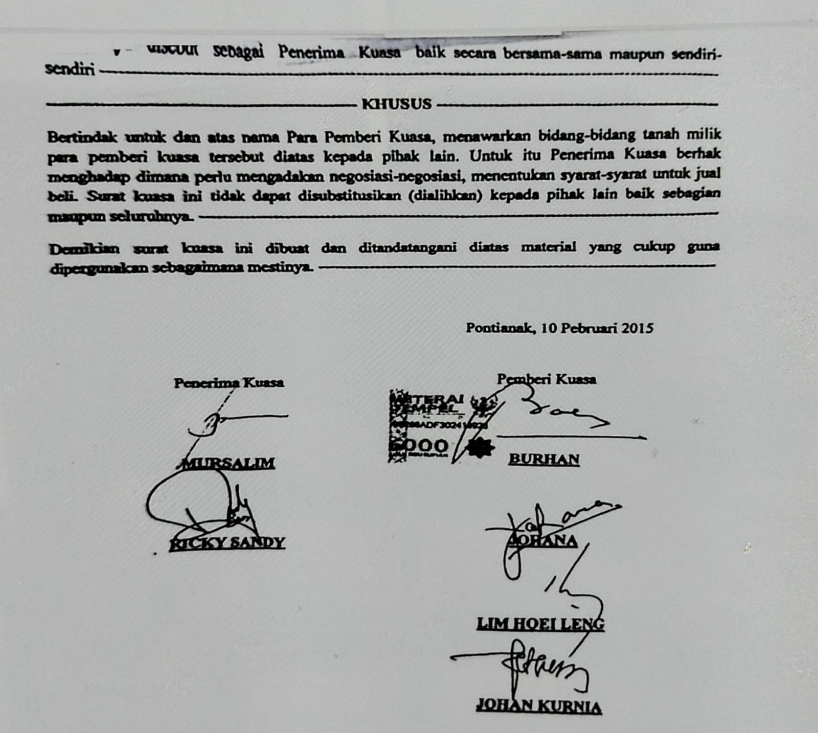 Dalam proses jual beli tanah tersebut, terdapat dua nama penerima kuasa yang berperan penting yakni Mursalim dan Ricky Sandy.