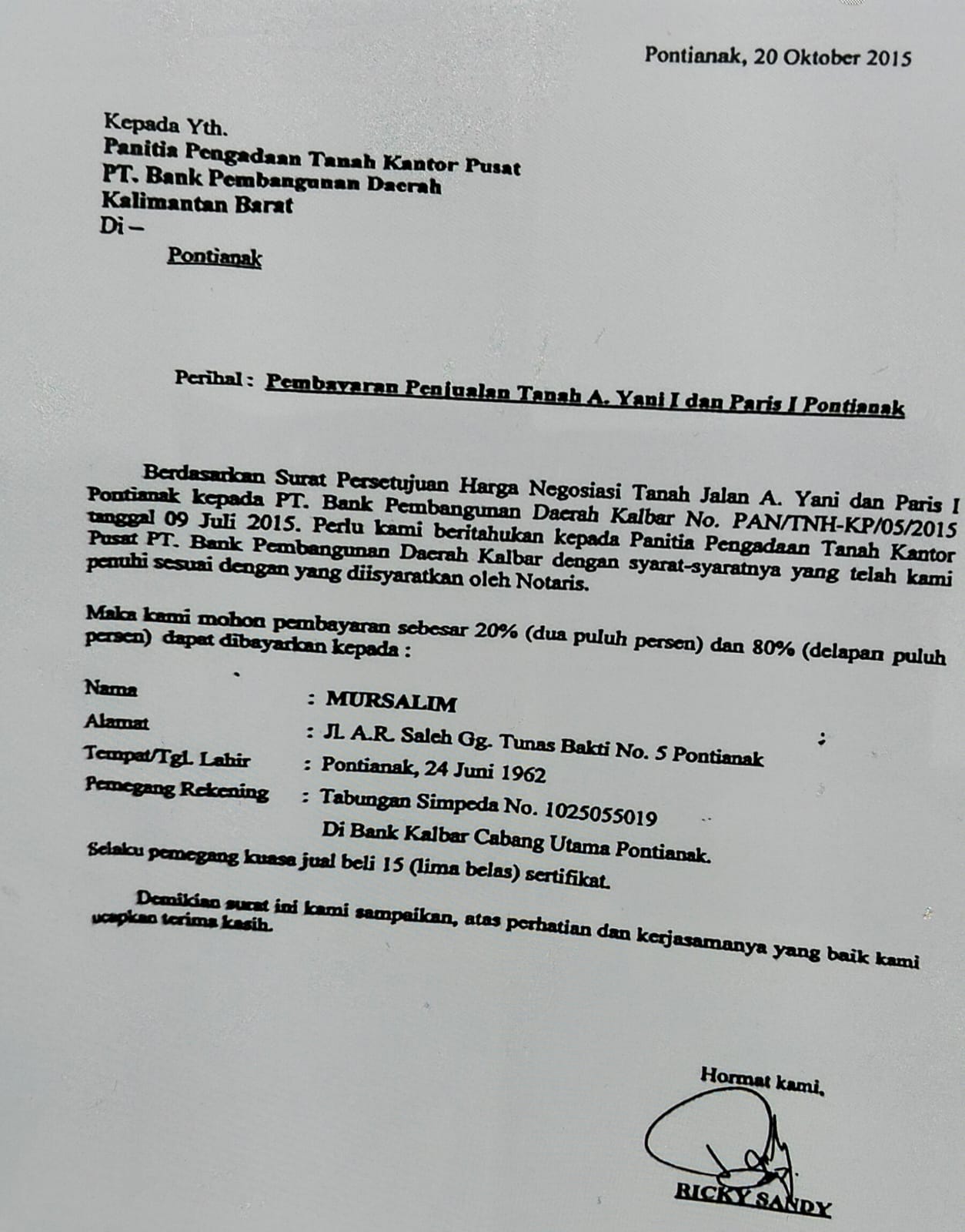 Data yang di himpun ruai.tv menunjukkan Ricky Sandy berperan lebih banyak dari PAM. Keduanya menerima kuasa dari pemilik tanah atas nama BU, JO, LHL, dan JK pada 10 Februari 2015 di Pontianak.