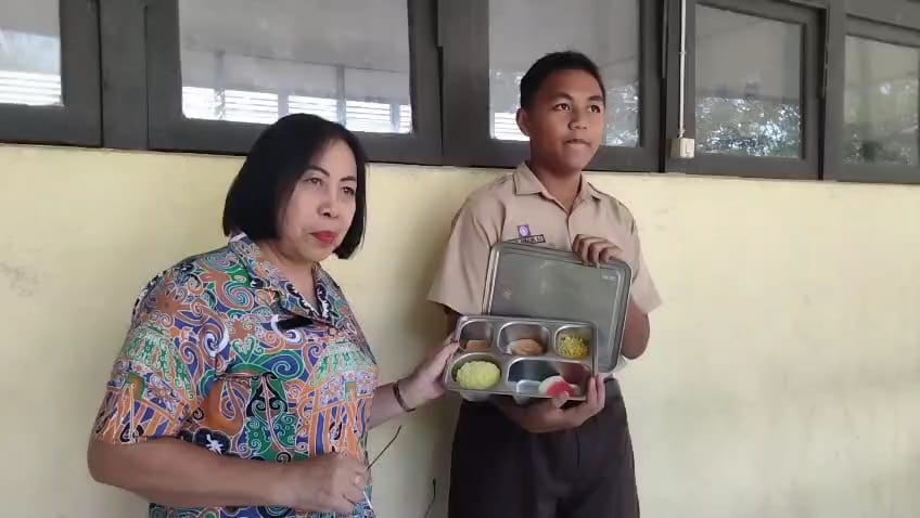 Kepala SMP Negeri 1 Bengkayang bersama siswa memperlihatkan menu Makan Bergizi Gratis kepada wartawan. (Foto/ruai.tv)