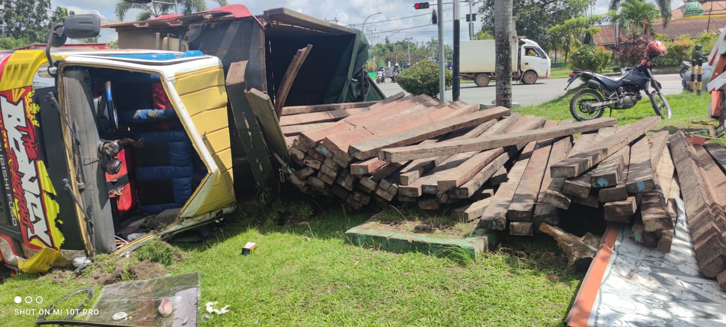 Selain menabrak pengendara roda dua, truk ini juga menghantam plang ikonik bertuliskan “Kubu Raya Menanjak.” Kayu-kayu yang di angkut truk di ketahui berasal dari Randau Jungkal, Kecamatan Sandai, Kabupaten Ketapang.