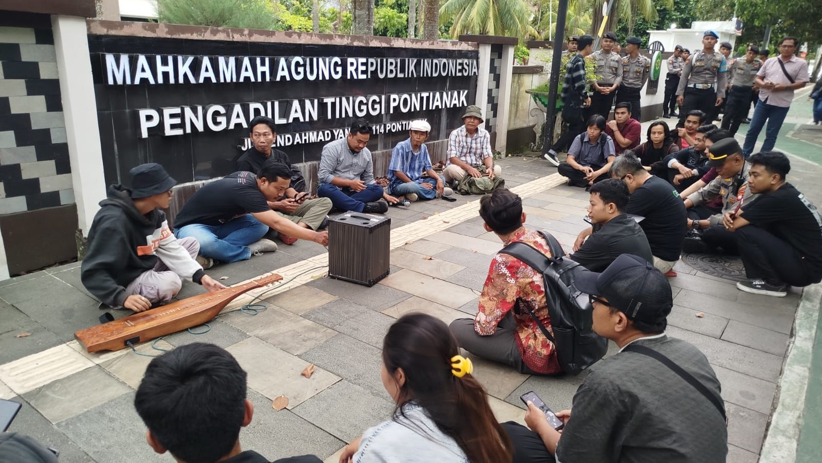 PONTIANAK, RUAI.TV – Puluhan aktivis organisasi masyarakat sipil dan mahasiswa menggelar aksi diskusi di depan Pengadilan Tinggi Pontianak, Jumat sore (14/3/2025).