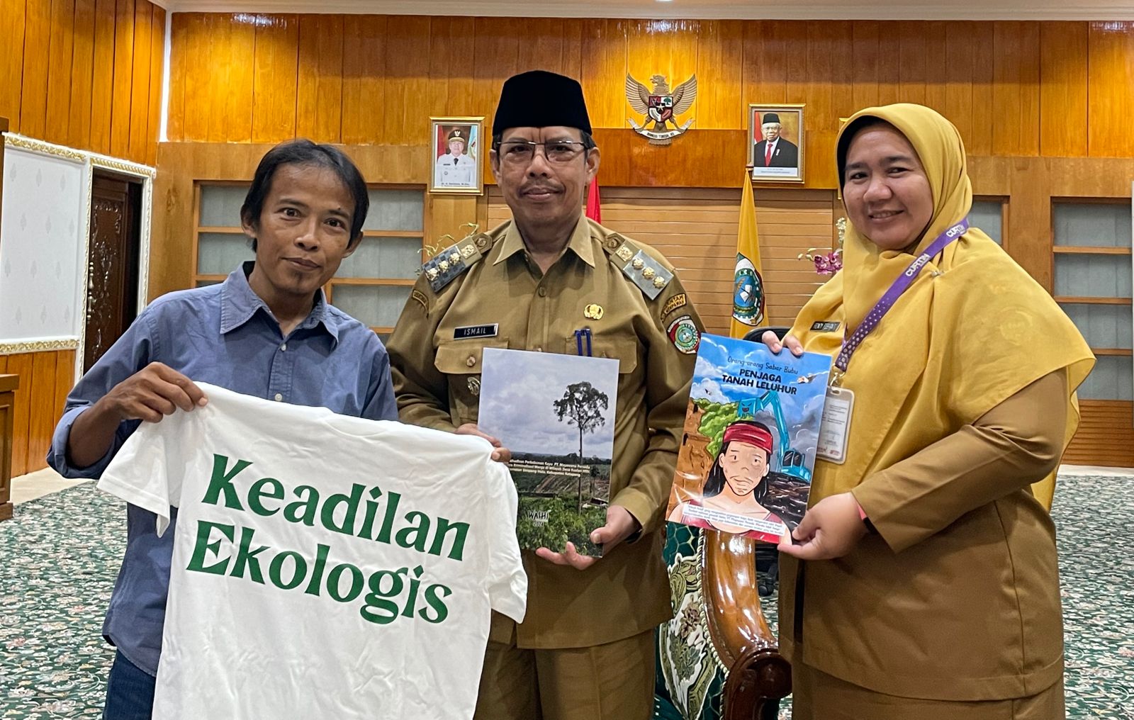 “Orang-orang Sabar Bubu, Penjaga Tanah Leluhur,” kronik kehadiran perusahaan perkebunan kayu, serta kaos bertuliskan ‘Keadilan Ekologis’ kepada Pj Bupati Mempawah. (RED)