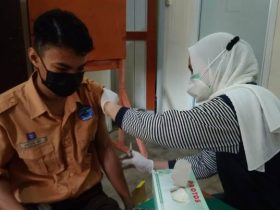 Para peserta didik di SMA Santo Paulus, Kompleks Persekolahan Katolik Nyarumkop (PKN) menerima vaksinasi ...