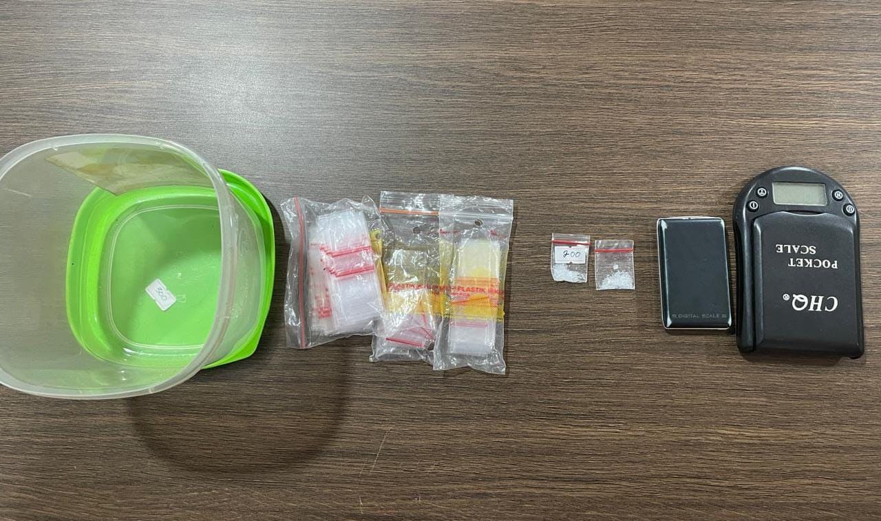 Dari pelaku S, polisi berhasil menyita dua kantong klip berisi serbuk putih yang diduga narkotika jenis sabu, satu toples dengan tutup hijau berisi timbangan digital, serta beberapa kantong klip kosong yang diduga digunakan untuk membungkus narkotika.