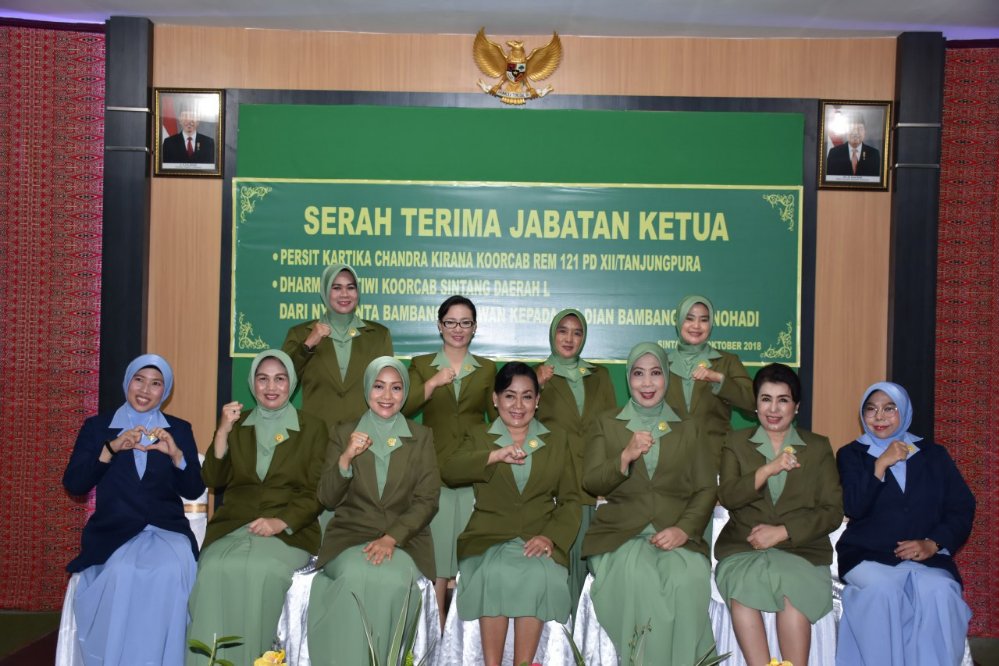 SINTANG – Hindari foto-foto yang diviralkan yang dapat membuat asumsi, bahwa Persit berpolitik, kita berhak memilih, tetapi tidak berhak mempengaruhi, apalagi dengan menggunakan atribut Persit dan fasilitas TNI,” tegas Ketua Persit KCK PD XII/Tanjungpura saat memberikan sambutan pada acara serah terima jabatan Ketua Persit Kartika Chandra Kirana Koorcab Rem 121 PD XII/Tanjungpura dari Ny. Shinta Bambang Ismawan kepada Ny. Dian Bambang Trisnohadi, di Aula Makorem 121/Abw, Jalan Pangeran Kuning, Sintang, Kalimantan Barat, Selasa (23/10/2018).