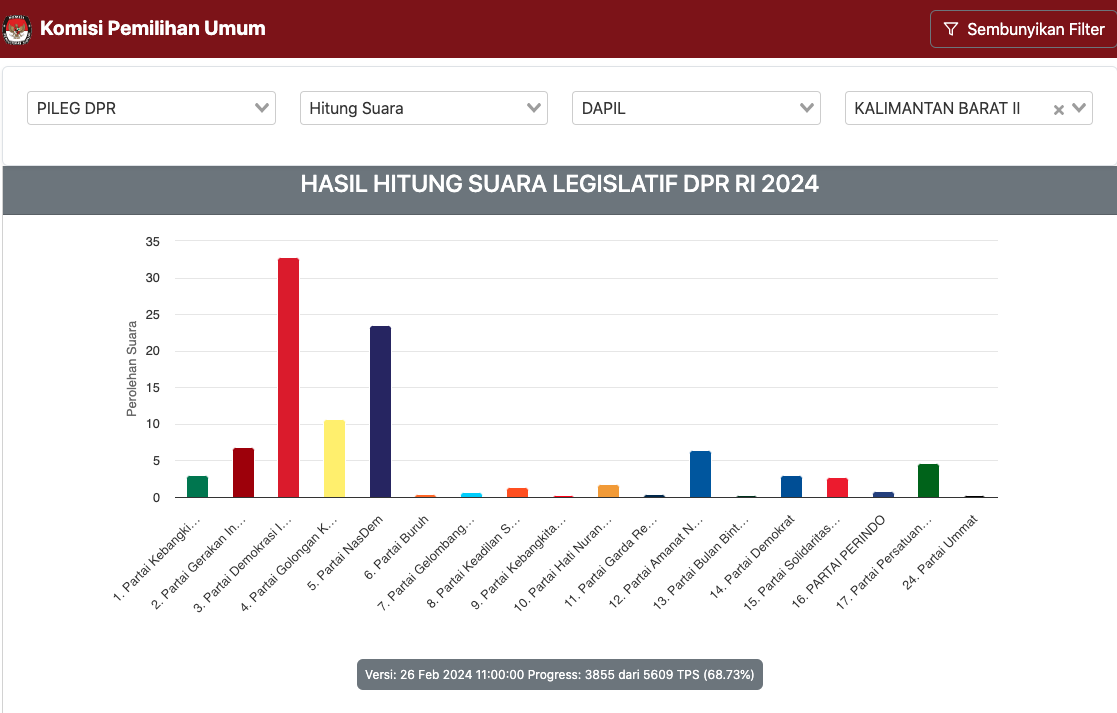 Real count KPU di laman pemilu2024.kpu.go.id, Senin (26/02/2024) pukul 11.00 WIB, data masuk 3.855 TPS atau 68,73 persen dari total 5.609 TPS menunjukkan, perolehan suara partai berlambang kepala banteng bermoncong putih itu, unggul jauh dari partai politik lainnya, yaitu sebanyak 185.526 suara, atau 32,83 persen. Sementara, partai Nasional Demokrat (NasDem) membuntuti, dengan perolehan 132.838 suara, atau 23,51 persen.