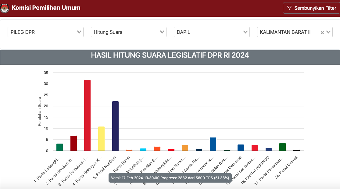 Pantauan ruai.tv di laman pemilu2024.kpu.go.id Minggu (18/02/2024) pukul 10.00 WIB, data masuk masih per Sabtu (17/02/2024) pukul 19.30 WIB menunjukkan, PDI Perjuangan memimpin perolehan suara sebanyak 135.977 suara atau 31,8 persen. Untuk perolehan suara terbanyak kedua diraih partai NasDem sebanyak 95.067 suara atau 22,3 persen.