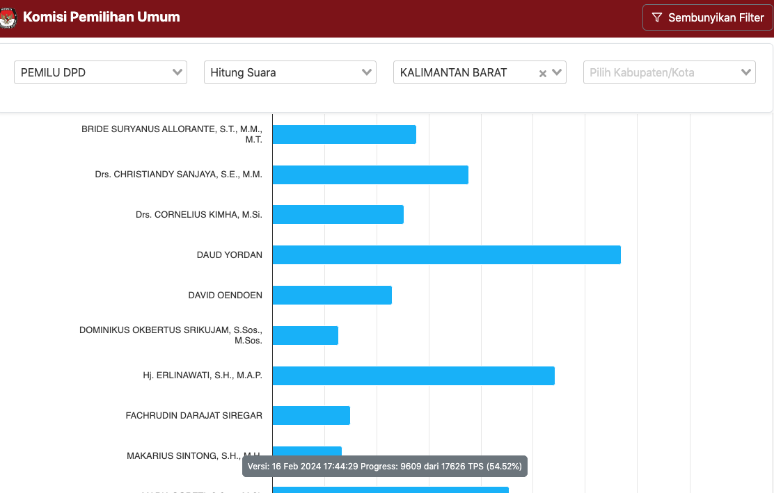 Berikut perolehan sementara suara Calon DPD RI Kalimantan Barat, sesuai real count KPU: