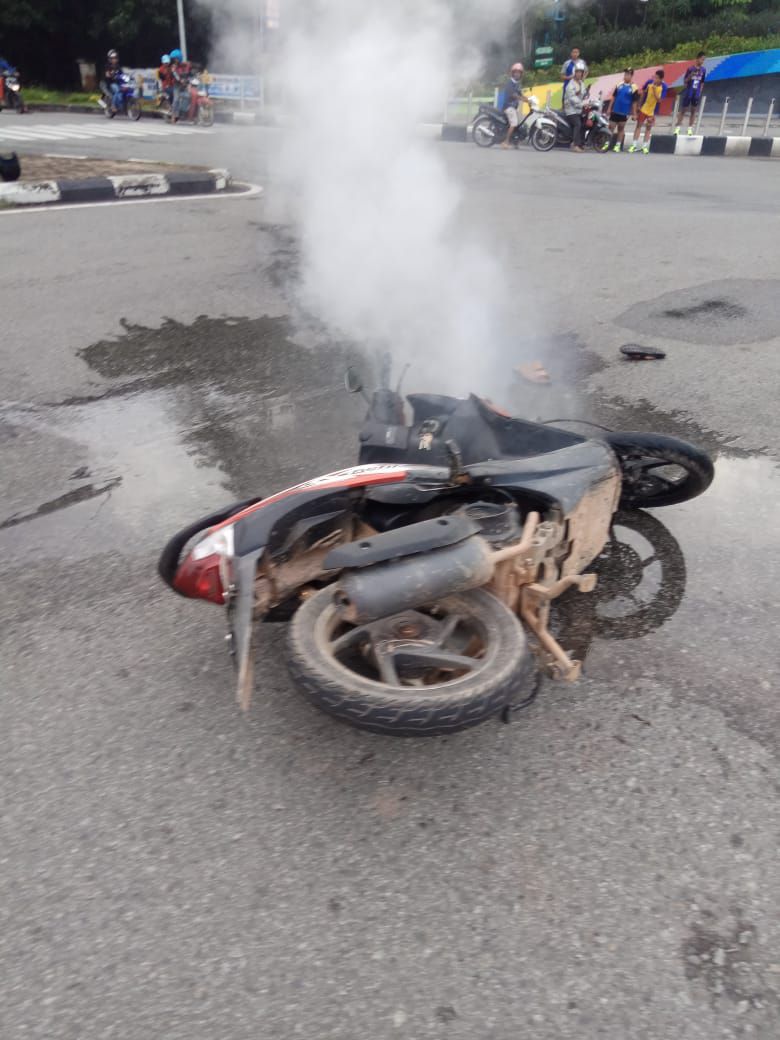Api tersebut keluar secara tiba-tiba dari jok motor yang sedang dikendarai. Beruntung pengendara dengan cepat membanting kendaraannya dan dibantu warga lainnya mengambil air di dalam kolam air mancur Digulis untuk menyiram api yang sedang menyala.