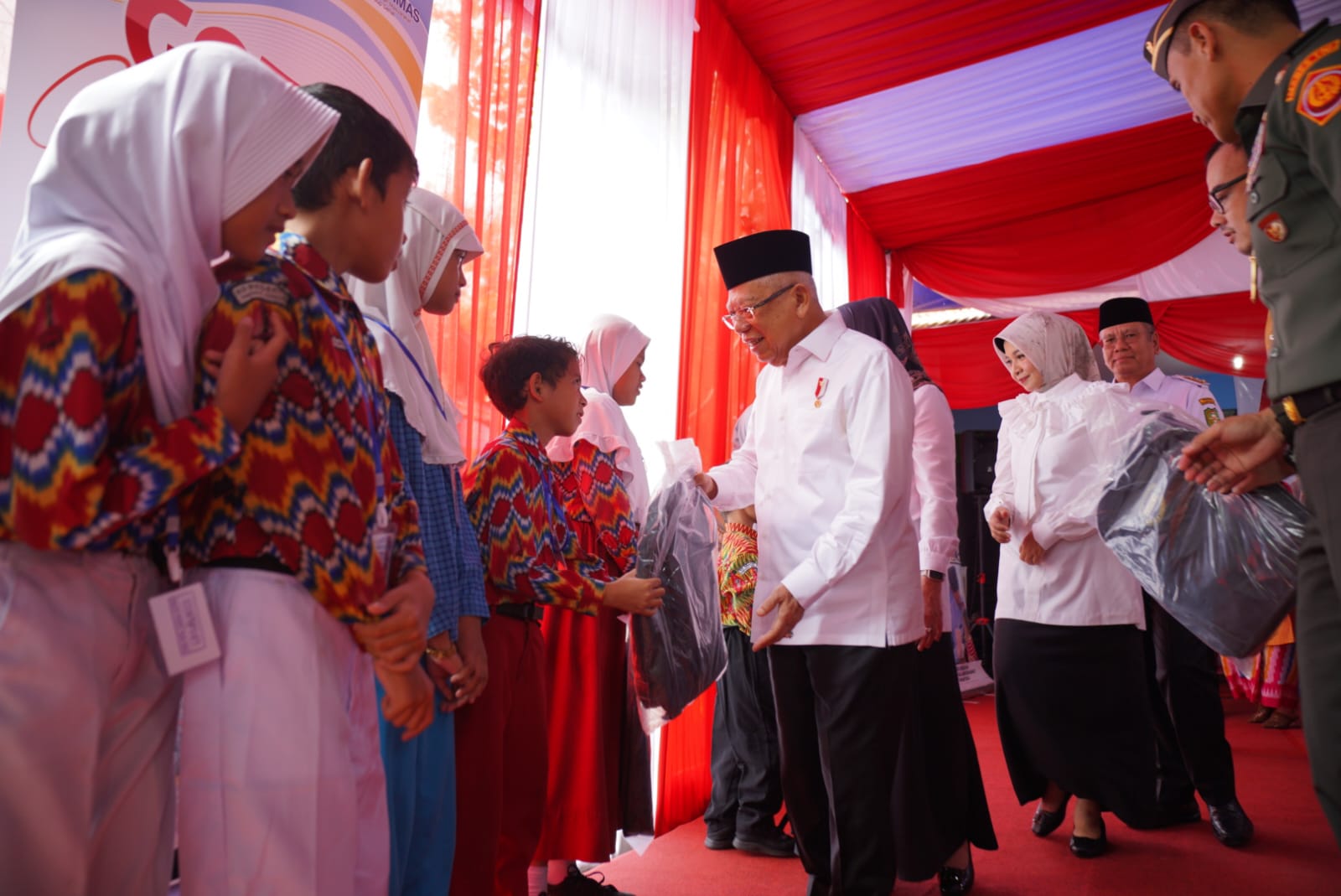 Wakil Presiden RI, Ma'ruf Amin, menyerahkan bantuan perlengkapan sekolah kepada siswa Kota Pontianak, Rabu (27/03/2024). (Ist/ruai.tv)