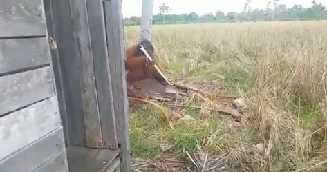 Rekaman video amatir warga menangkap sosok orangutan ini sedang memakan umbut, sambil bersembunyi di semak-semak. Selain itu, sebuah foto menampakkan satwa ini sedang memakan umbut tidak jauh dari pondok kebun warga.