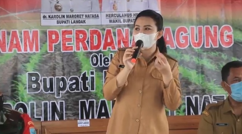 NGABANG, RUAI.TV – Bupati Landak Karolin Margret Natasa, melakukan penanaman perdana jagung di Dusun Jamai, Desa Amboyo Inti, Kecamatan Ngabang, Senin (22/02/2021).