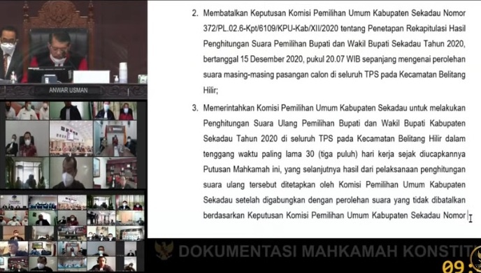 PONTIANAK, RUAI.TV – Rapat Permusyawaratan Hakim Mahkamah Konstitusi (MK) yang diketuai Anwar Usman, Jumat (19/03/2021) membacakan putusan atas perkara nomor 12/PHP.BUP-XIX/2021, yakni Perselisihan Hasil Pemilihan Bupati Kabupaten Sekadau Tahun 2020.