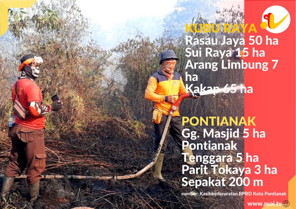 Kepala Seksi Kedaruratan Badan Penanggulangan Bencana Daerah (BPBD) Kubu Raya, Sulistiono, memaparkan, daerah yang terbakar mencakup Rasau Jaya 50-an hektar, Sungai Raya sekitar 15 hektare, Arang Limbung sekitar 7 hektare, dan Sungai Kakap sekitar 65 hektare.