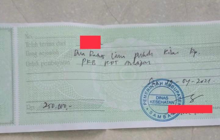 Bahkan beredar sebuah rekam layar kuitansi dengan cap basah Dinas Kesehatan Kabupaten Sambas, serta tertera biaya Rp 250 ribu.