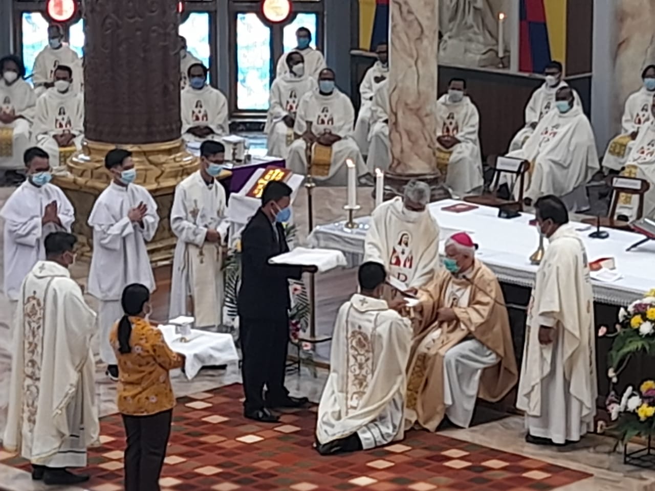SANGGAU, RUAI.TV – Uskup Keuskupan Sanggau, Mgr Guilio Mencuccini, CP, menahbiskan dua pastor baru di Gereja Katedral Hati Kudus Yesus, Kamis, (4/03/2021).
