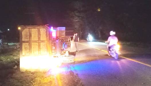 Sementara dump truk mengalami hilang keseimbangan, sehingga tumbang dengan posisi bagian depan sampai berputar arah ke belakang.