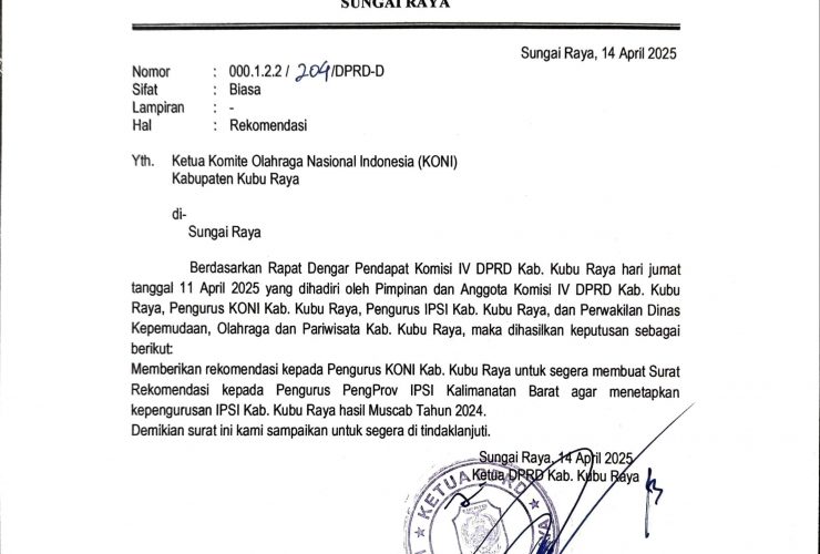 KUBU RAYA, RUAI.TV – DPRD Kabupaten Kubu Raya meminta Komite Olahraga Nasional Indonesia (KONI) Kubu Raya segera menyurati Pengurus Provinsi (Pengprov) IPSI Kalimantan Barat untuk menetapkan pengurus IPSI Kubu Raya hasil Musyawarah Cabang (Muscab) tahun 2024. Permintaan itu tertuang dalam ...