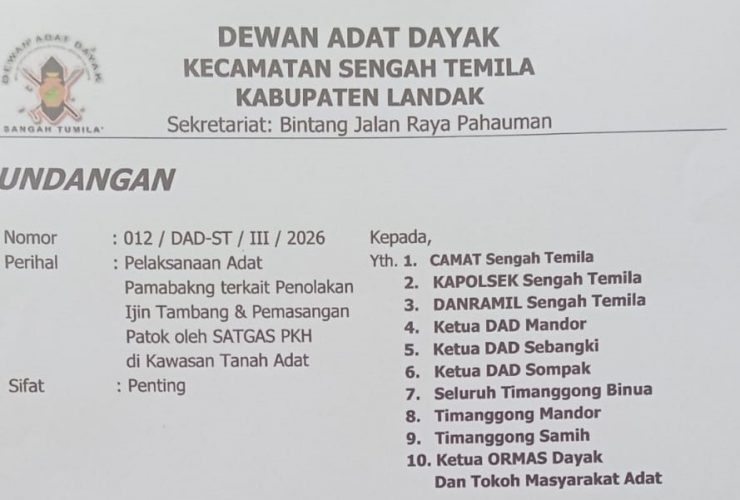 LANDAK, RUAI.TV – Dewan Adat Dayak (DAD) Kecamatan Sengah Temila, Kabupaten Landak, menggelar ritual adat Pamabakng sebagai bentuk penolakan terhadap aktivitas pertambangan dan pemasangan patok oleh Satgas PKH di kawasan tanah ulayat. Ketua DAD Sengah Temila, Munidin, menyampaikan bahwa langkah ...