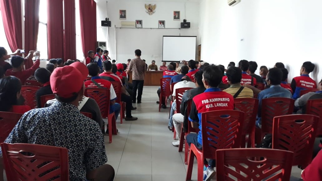 Ratusan karyawan PT. DSM (Group HPI Agro) bersama Konfederasi Serikat Buruh Sejahtera Indonesia (KSBSI) Cabang Kabupaten Landak mendatangi Kantor Bupati Landak, Kamis (7/6/2018). Kedatangan mereka untuk menyuarakan lima (5) tuntutan diantaranya meminta pihak perusahaan mengakomodir hak-hak normatif karyawan seperti menuntut ...